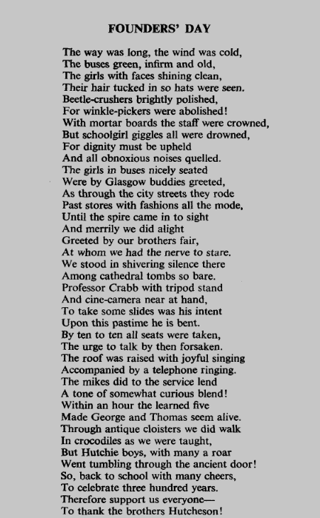 The photo was brought in by Rector J M Hutchison with the hope that it would serve to perpetuate the ‘old traditions and stimulate School loyalties’. For years, Founders’ Day merited a supplement to accompany the Hutchesonian, and you could obtain your own copy of the address after the event.