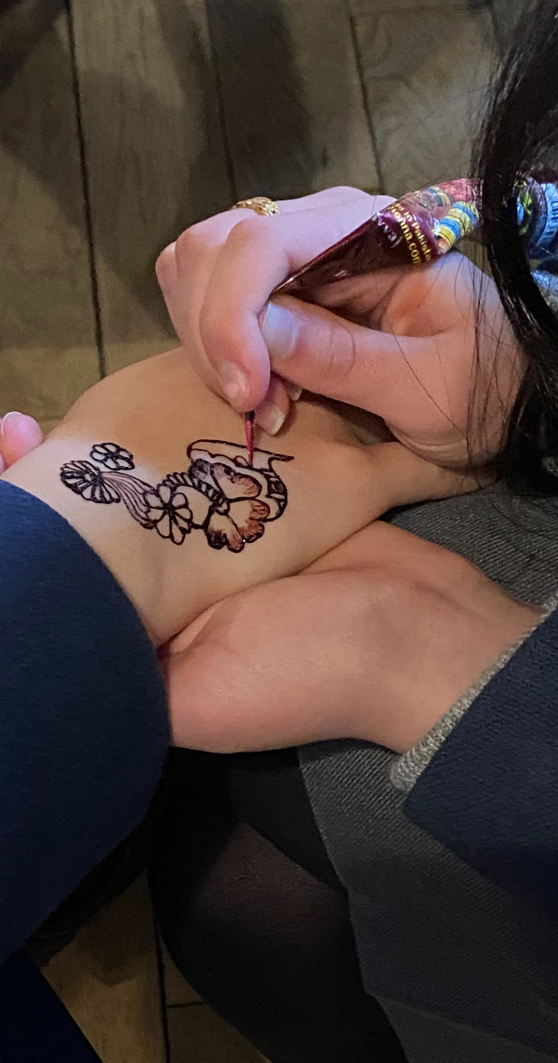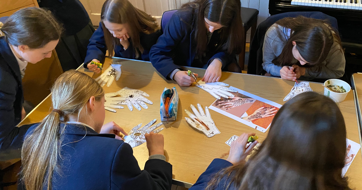 An Art Workshop was held on Wednesday, and everyone was welcome to come along and get their hands dirty making a Henna hands art display and creating patterns of geometric Islamic or African tiles. Coincidentally the Hindu festival of Holi was also on Wednesday which focuses on colour, and colourful rangoli was created to decorate the library corridor.