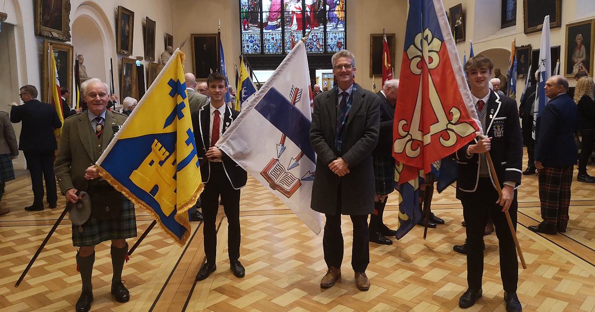 In light of Lord Lyon presenting us with the ability to include supporters on our school crest, we were invited to the Festival of Heraldry in Edinburgh to represent the school. After an early start and over an hour of travelling we arrived at Parliament House, where we were presented with the Hutchesons’ Banner and the English Society of Heraldry Banner by former pupils Spencer Veitch C1970 and Ian Lennox C1966.