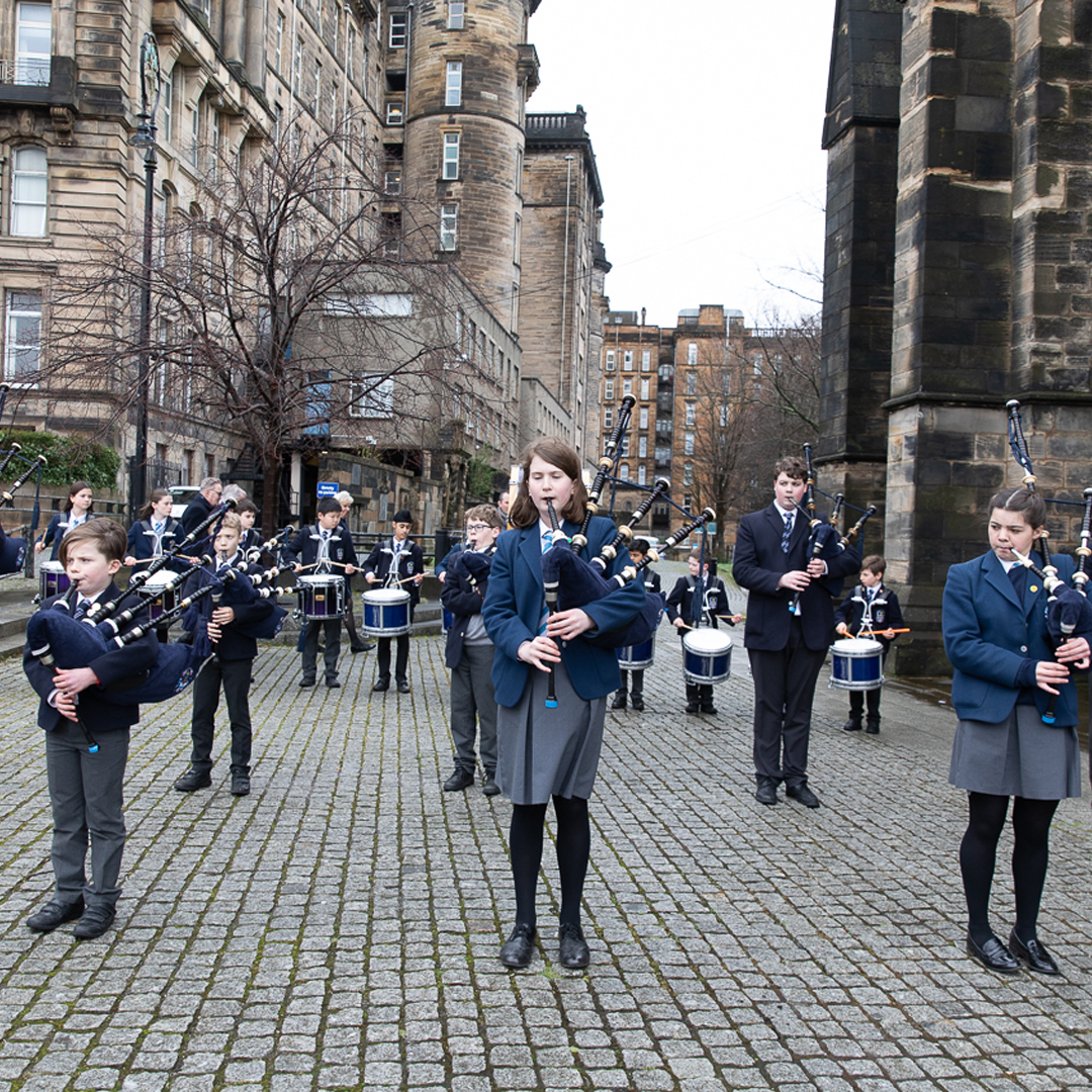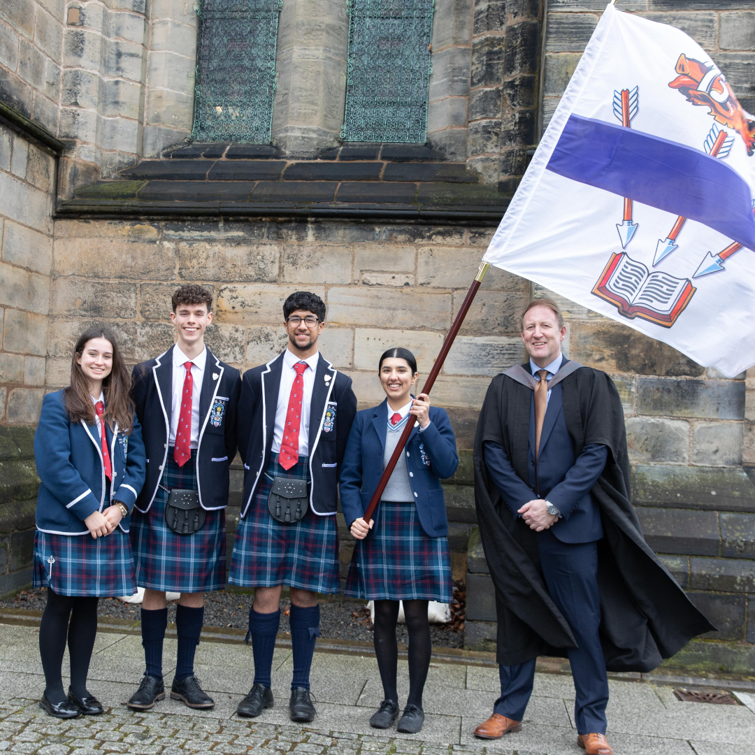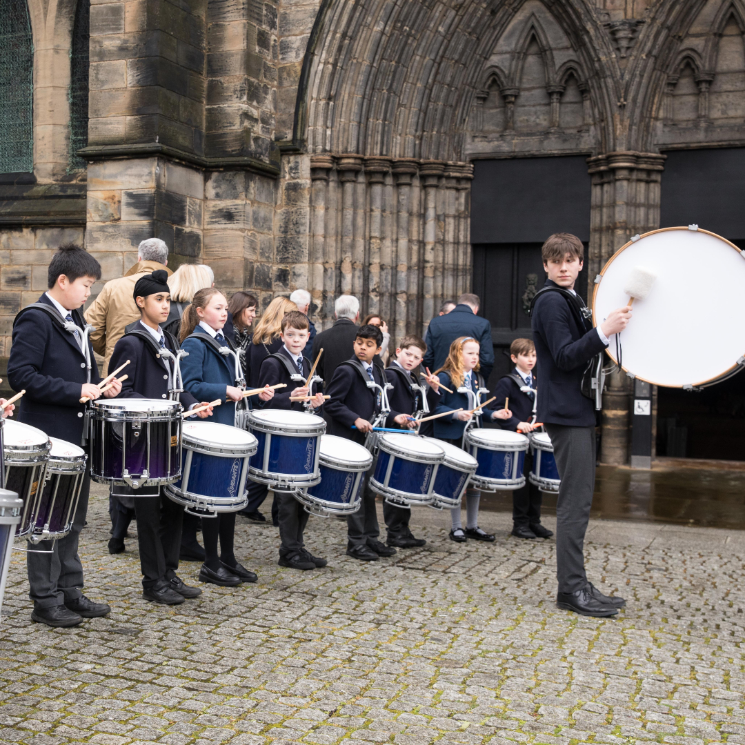 Our Primary 7 pupils, along with S4 – S6 senior pupils and staff, made their way inside with a rousing welcome from our Pipe Band. This was a highlight for many, with even the public stopping to listen on their way past. Rev Mark Johnstone welcomed everyone before, Rector, Mike Martin, gave words of commemoration. Head Girl Beth read The Old Testament Book of Psalms, Psalm 139 vs 1 – 12 and 23 – 24, while Head Boy Henry read Paul’s First Letter to the Corinthians, Chapter 13 vs 4- 13, both speaking with grace and confidence.