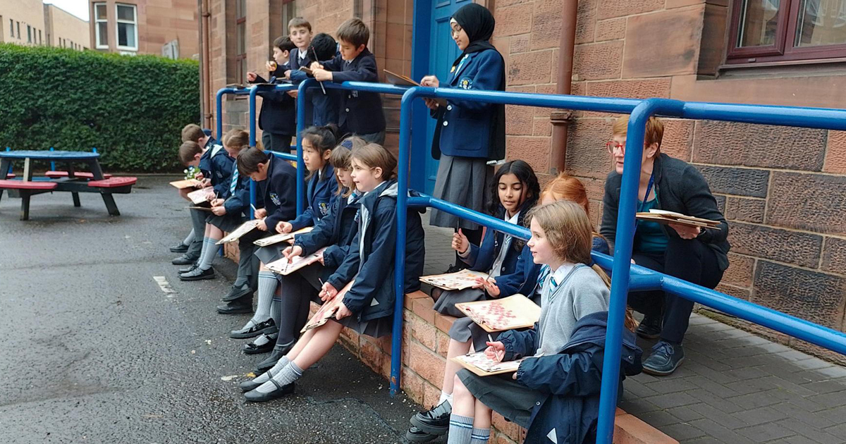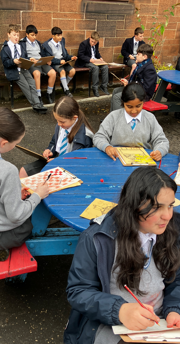 “Pupils were fully engaged as they explored famous artworks virtually, sharing their observations and insights. Taking their learning outdoors, they created collages inspired by the surrounding tenement buildings, deepening their connection to the rich history and culture of Glasgow’s Southside. This immersive experience highlighted the importance of their local heritage in the wider context of the art world, showing how their community’s unique story contributes to a broader cultural narrative.”