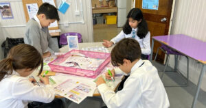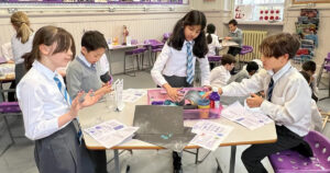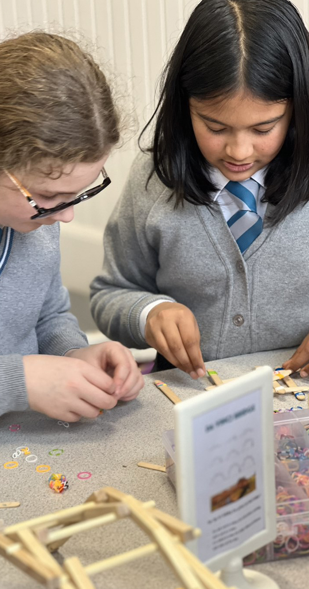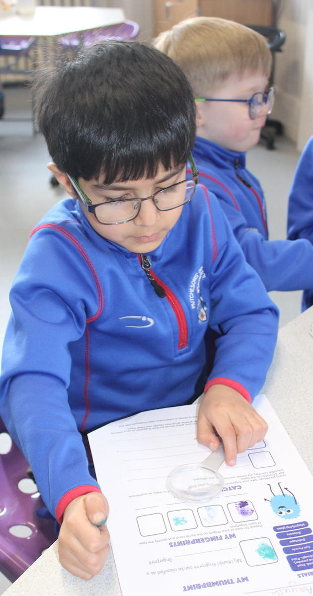 Our Nursery and Pre-School children were first to head to the Science Base, and with some help from the P7 pupils, were able to build a Da Vinci Bridge, examine their own fingerprints with a magnifying glass and take their own fingerprints. They also set up an experiment to show rainbow water travelling upwards against gravity through a process called capillary action.