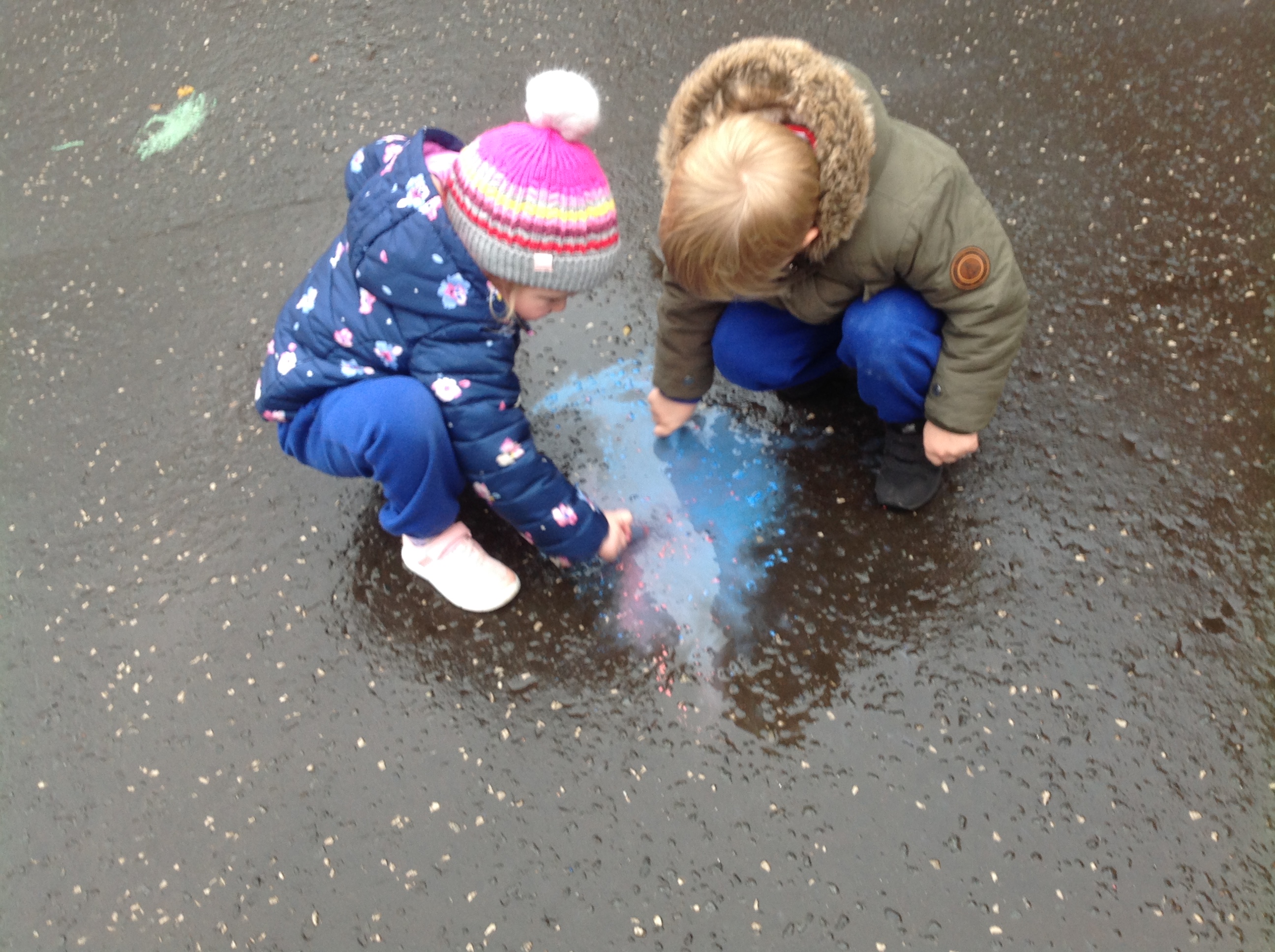 Outdoors, the children have enjoyed large scale collaborative painting and pattern making and have proved that you can have lots of fun turning chalk into paint on rainy days.